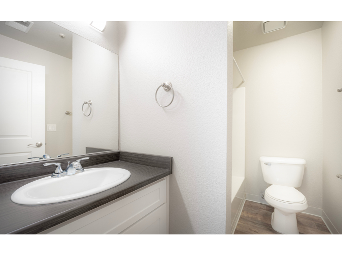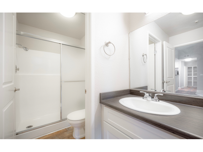 Residence 2: Two Bedroom / One Bath 821 Sq. Ft. A graceful window adorns the large modern kitchen which features abundant cabinets and counters. The master suite features a private vanity and sink and oversize closet. The second bedroom offers you a multitude of living options-roommate, home office, nursery, hobby room, you name it-it works.