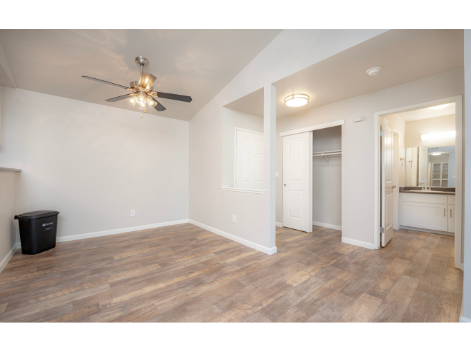 Residence 1: One Bedroom / One Bath 639 Sq. Ft. The master suite of this residence creates the ultimate cozy retreat with its corner location, allowing the abundance of windows to bathe your suite in warm natural light. A large walk-in closet, private patio and other convenient features are designed to thoughtfully accommodate those who wish to relax and recharge after a busy day.